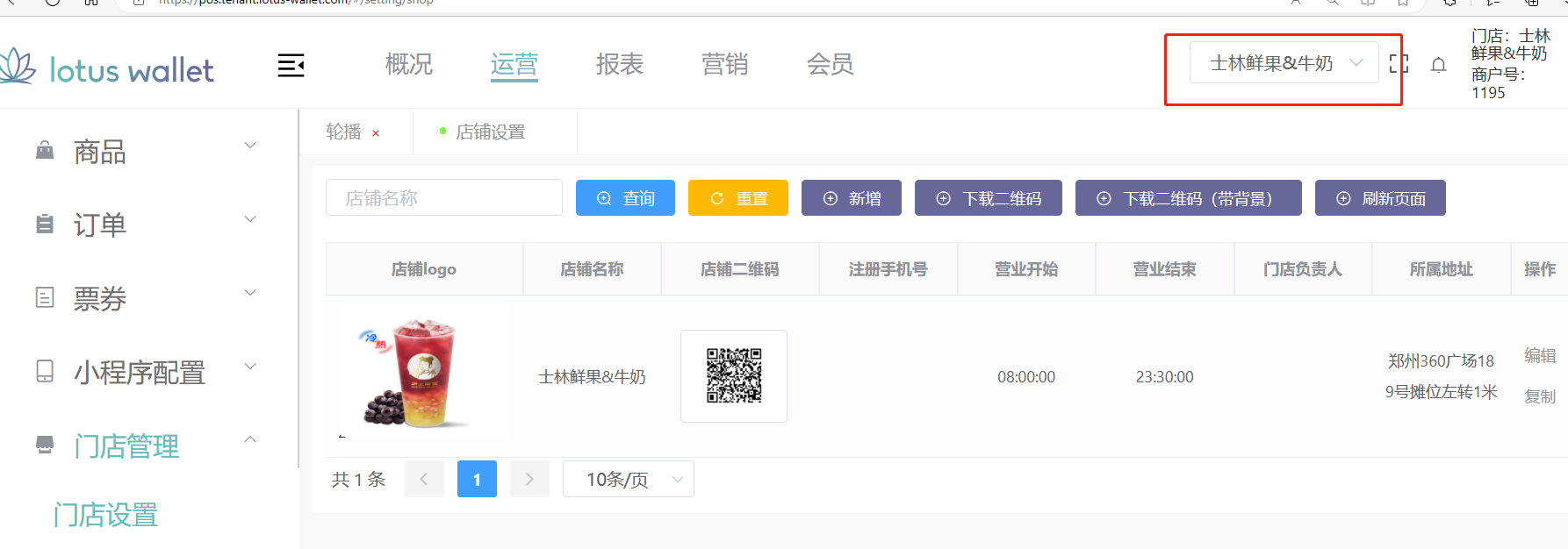 门店轮播图一般展示在每个门店的上方,在【运营】--【门店管理】--【轮播】进行添加设置;类型选择首页轮播,添加成功后在小程序展示为图所示; Alt text
