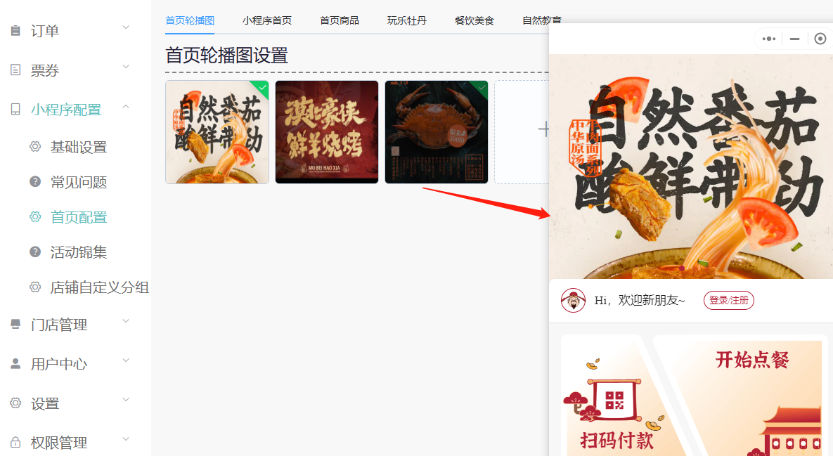 小程序首页会有轮播图的展示,在商家端 【小程序配置】--【首页配置】--【首页轮播图】 进行添加;