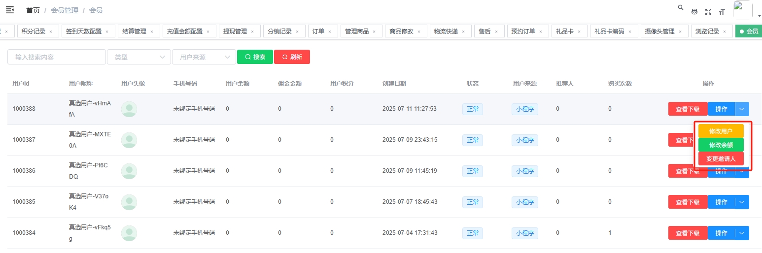 - 财务状况:实时查看会员的佣金余额、积分余额。