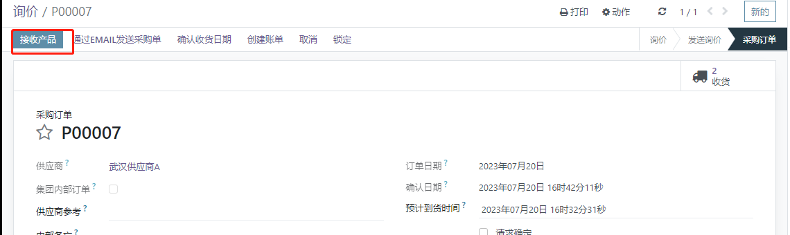 点击“确认订单”按钮后,再点击“接收产品”按钮进入收货入库界面