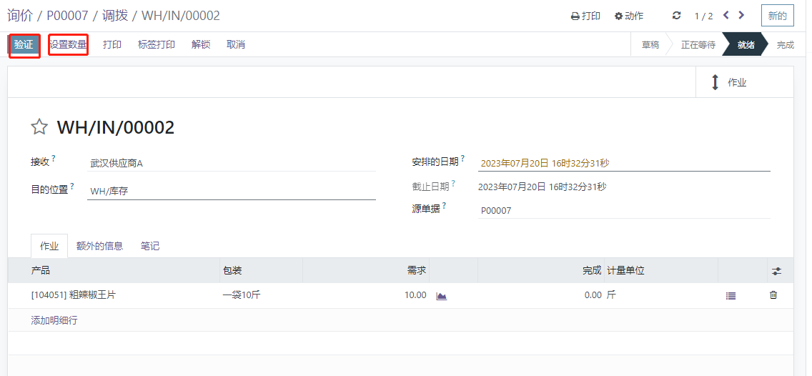 点击“设置数量”后,再点击“验证”按钮:设置数量为收货入库的数量,可根据实际收货情况调整。