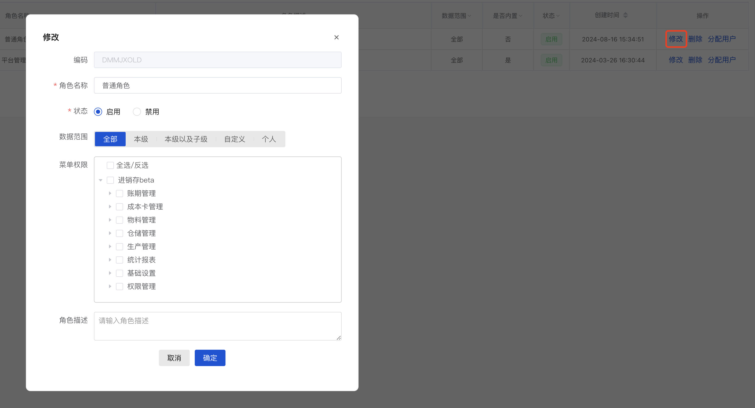 - 角色禁用:设为“禁用”状态后,该角色下的所有关联用户将失去对应权限,直至恢复启用。