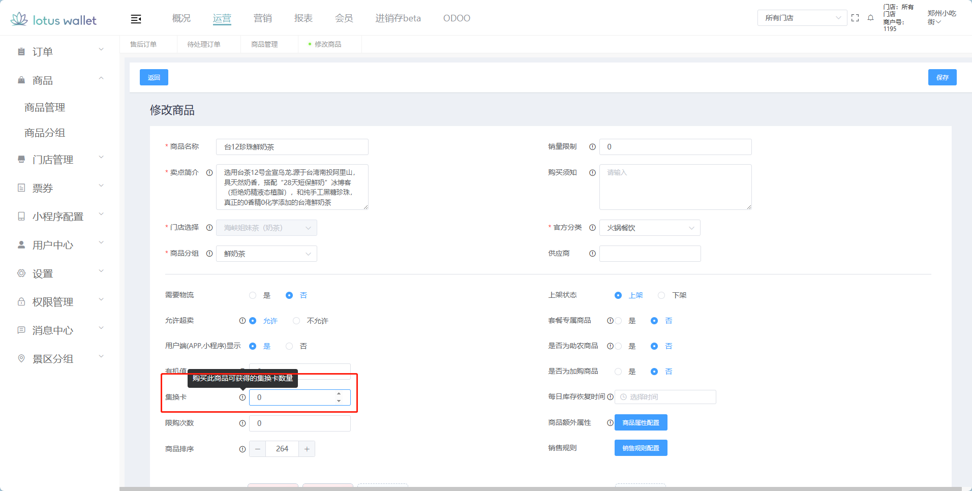 运营->商品->商品管理->编辑。 - 配置要点:在商品编辑页找到“集换卡点”,设置每购买 1 件可获得的印章数(通常设置为 1)。